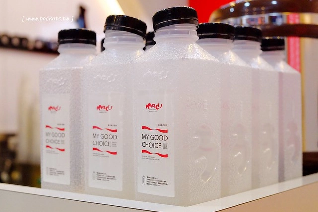 《麻古茶坊》的飲品除了750cc塑膠杯裝之外,還有這種960cc的美口瓶裝,耐熱度可達100℃,購買飲品時攜帶美口瓶重覆使用的話,可以折抵 $10元…