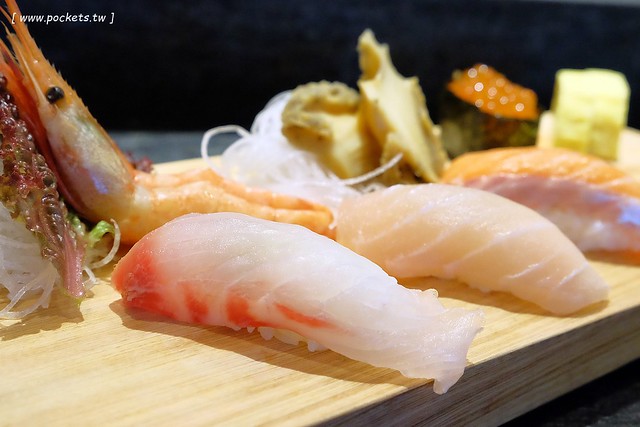 主食 – Menu上面寫壽司、鮑魚、甜蝦…不過看這盤,應該是有甜蝦、鮑魚、旗魚、紅魽、鮭魚、紅魽、玉子燒和鮭魚卵壽司…