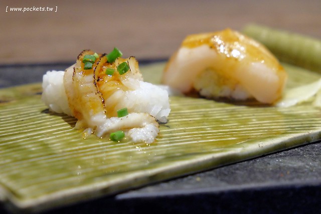 炙燒干貝 – $70元 / 炙燒比目魚 – $50元 – 因為我不敢吃生魚,所以另外點了三個炙燒的握壽司(不過只來兩個,以為是漏單,結果服務人員說因為食材賣完了…)