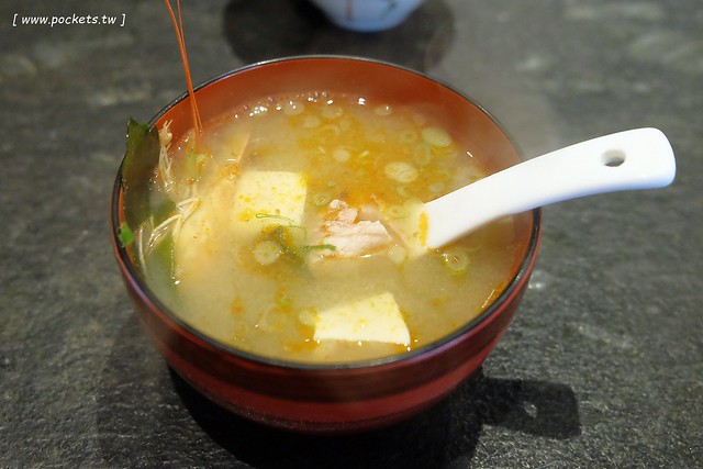 湯品 – 味噌湯,裡面還有鮭魚、蝦頭和豆腐…