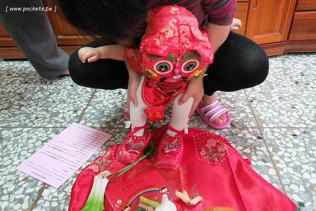 然後就拿蔥、拿蒜…在她面前做勢一下,接著讓她雙腳踩紅龜粿,代表…長壽、有福氣!