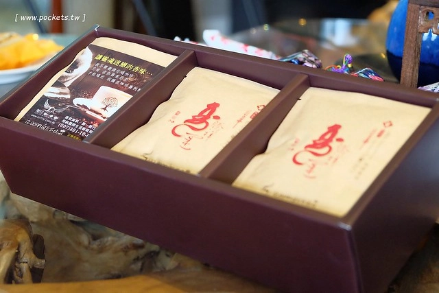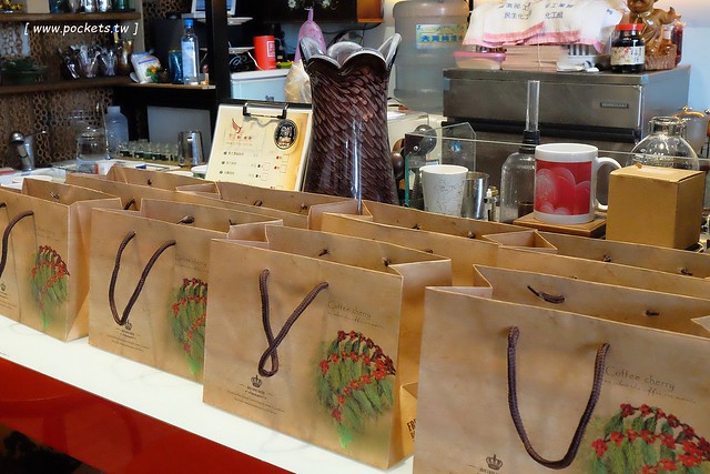 至於咖啡都是自家烘焙的,有耳掛包對外販售,包裝上面有根據豆子不同的風味而寫不同的文字,有幸福、快樂、還有年節祝詞哦!