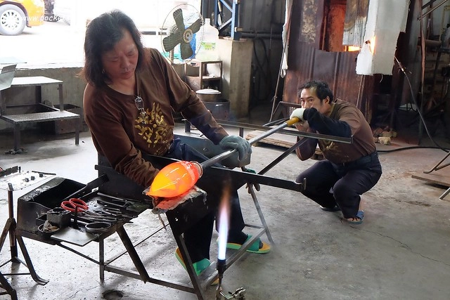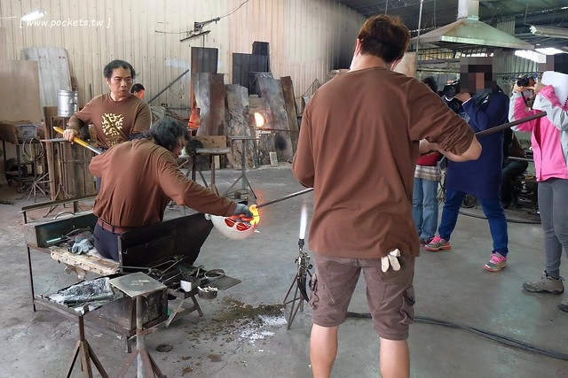 製作過程幾位師傅非常具有默契,完全不需要言語溝通,由林老師主導,其他師傅在一旁協助,一下子加熱,一下子吹氣、一下子塑型,膽大心細,一氣呵成…