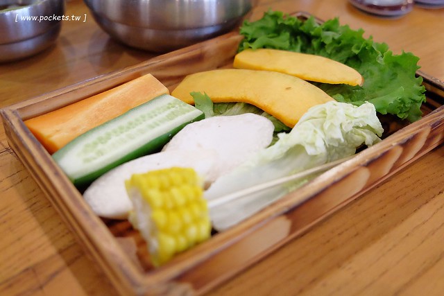 包菜盤…紅蘿蔔、小黃瓜、南瓜、杏鮑菇、玉米、大白菜、蒿苣…蒿苣可以拿來包肉,其他的都可以直接烤…