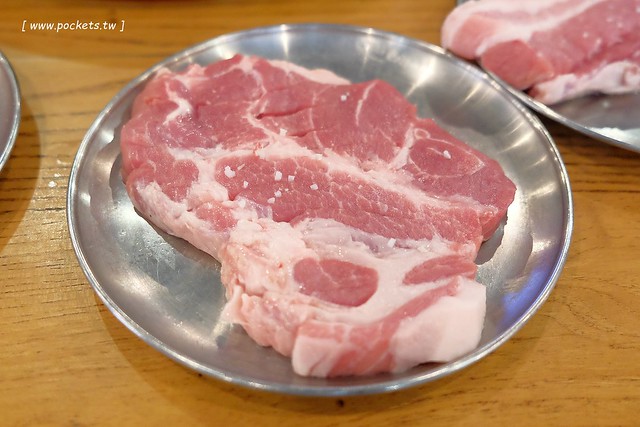 脖子肉 – $299元,吃韓國烤肉,五花肉才是王道,但是五花肉太肥,從頭吃到尾可能會膩,所以在服務人員的建議之下,我們點了一個脖子肉,服務人員說這個肥肉的比例比較不高,不過看照片還是覺得:好像和五花肉差不多…