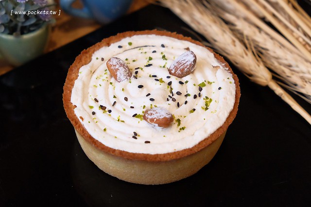客家擂茶重乳酪塔 – 內餡是擂茶慕斯,表層是鮮奶油和杏仁果,帶有淡淡的鹹味,所以吃起來鹹甜鹹甜的,口感很特別,很適合愛吃甜點又怕甜的朋友…