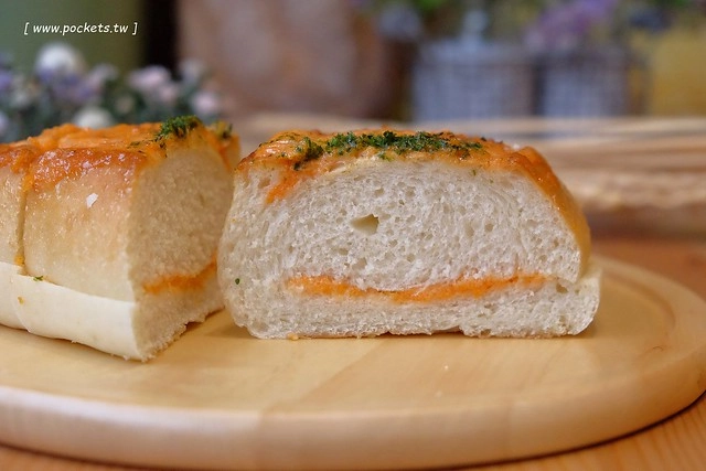 一般的明太子麵包多半使用的是硬法麵包,不過小舞台烘焙坊使用的是軟法,口感比較有筋性,也比較有咀嚼感…