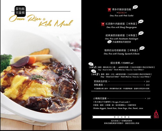 A套餐:+59元 附濃湯、麵包或沙拉二選一、$60元飲料四選一…(冰紅茶/柳橙汁/熱紅茶/熱綠茶)