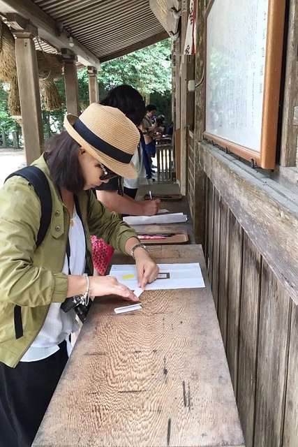 4. 到神社前,在許願石裡面的紙條上面寫好自已的願望…