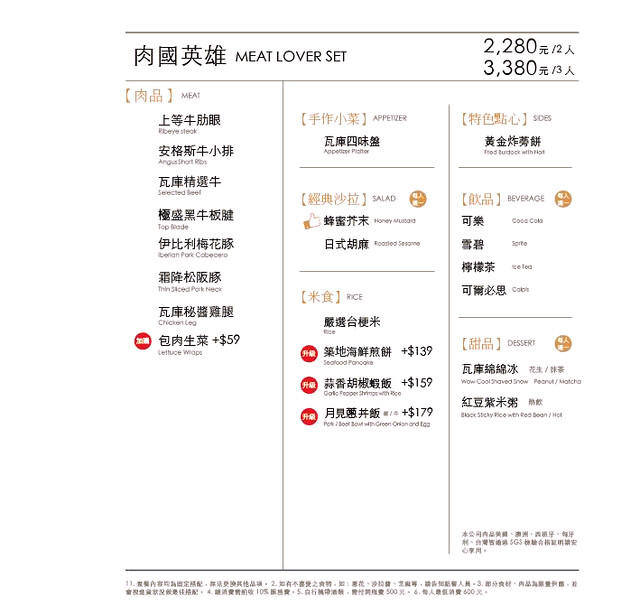瓦庫燒肉菜單共有五種價位套餐可以選擇:算命要我不吃牛、傑克船長的饗宴、川普大叔很牛逼、肉國英雄、老饕必吃…(菜單是可在店家網頁下載)