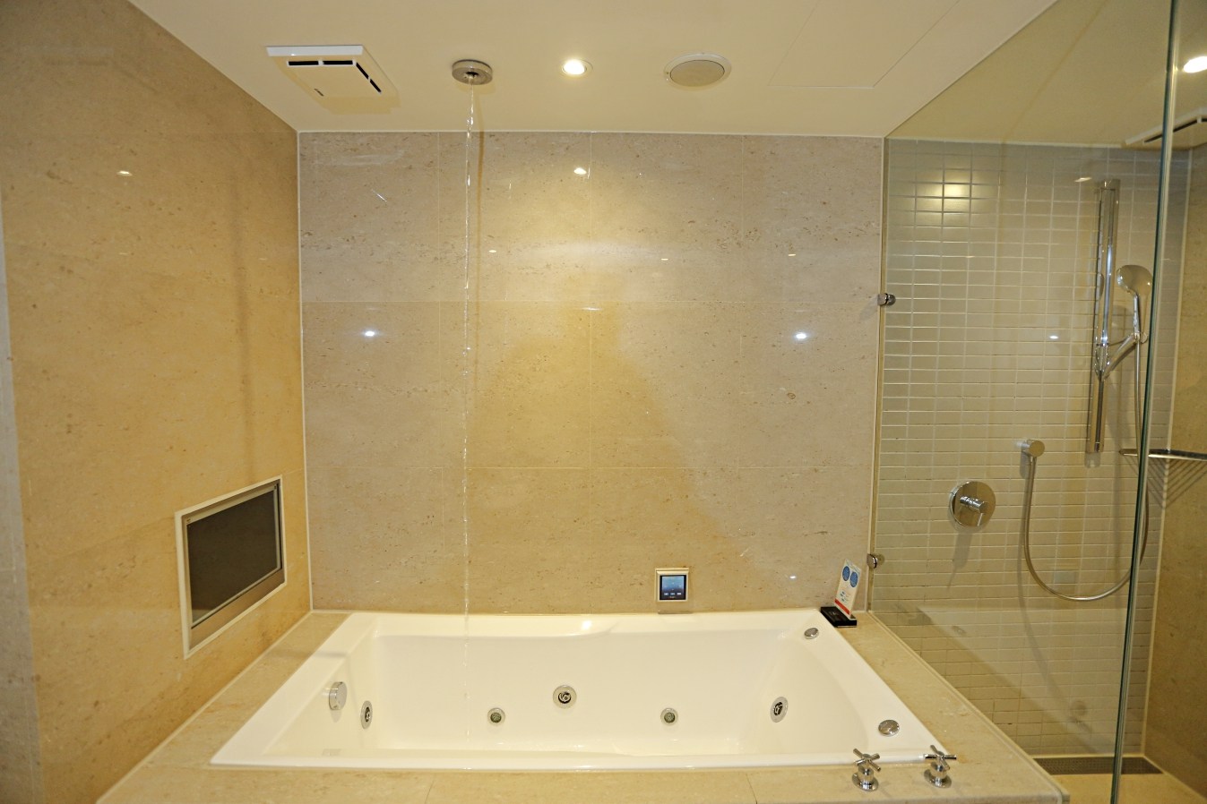 浴室有浴缸不算稀奇,最棒的的是居然還有微氣泡按摩浴缸,搭配從天花板像瀑布一樣的水流,泡澡的同時還可以邊看電視,真是大大的享受…