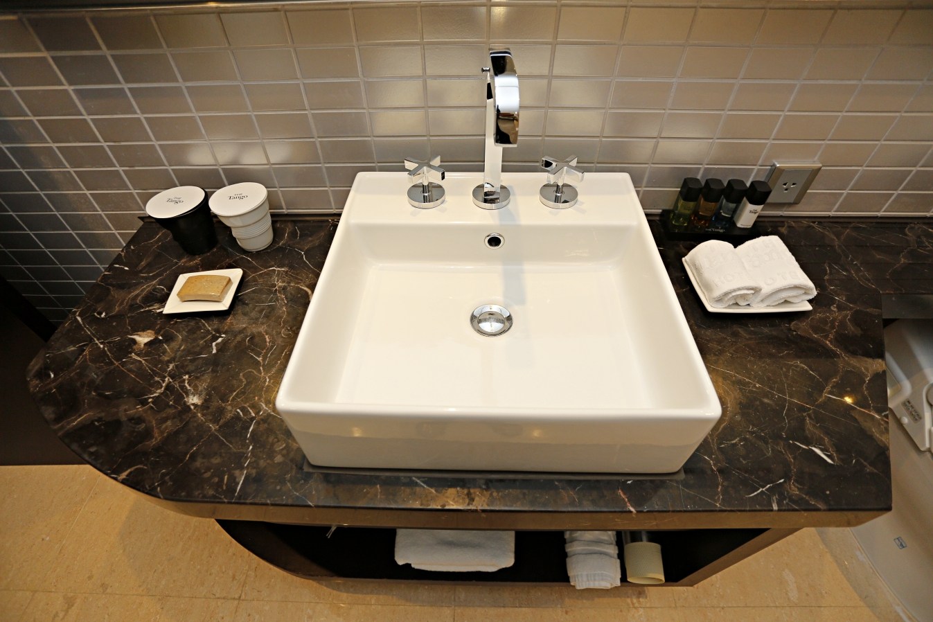 洗臉檯旁採用很有設計感的黑白水杯,旁邊放著是打上自有Logo的海藻皂,使用起來不刺激皮膚…