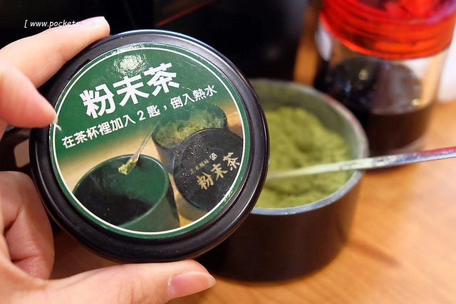杯子和醬油碟在座位的最上方,桌上則是擺放了沾醬,另外還有抹茶粉末可以自已泡來喝…