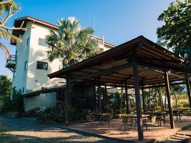 映入眼簾的是一棟三層樓的建築,鵝黃色的建築映襯著藍天白雲,頓時就有渡假的fu了…