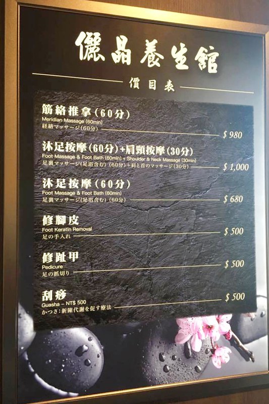 這裡有價目表,除了身體按摩和腳底按摩之外,也有修趾甲和刮砂…