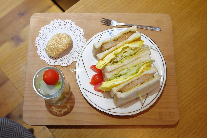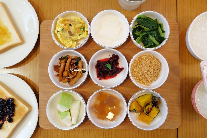 媽媽早上吃素,所以飯店人員為媽媽準備了一份素食的九宮格粥,我則是點了一份豬肋排三明治…