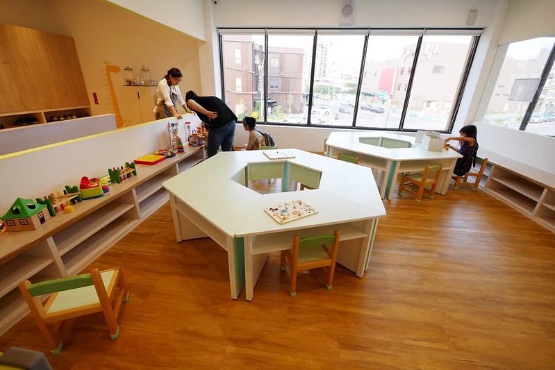 中央的桌子是六角形的設計,小朋友可以直接挑選喜歡的玩具去座位上玩…