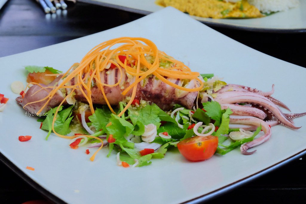 墨魚燙熟之後搭配新鮮的生菜,再淋上泰式醬汁,很辣但是很下飯,不過辣度有點驚人就是,我吃到差點噴火!