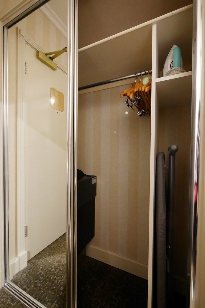 入口處的衣櫃算是小而巧,不但有連身鏡,裡面也有睡衣、燙衣板、熨斗、拖鞋和洗衣袋…