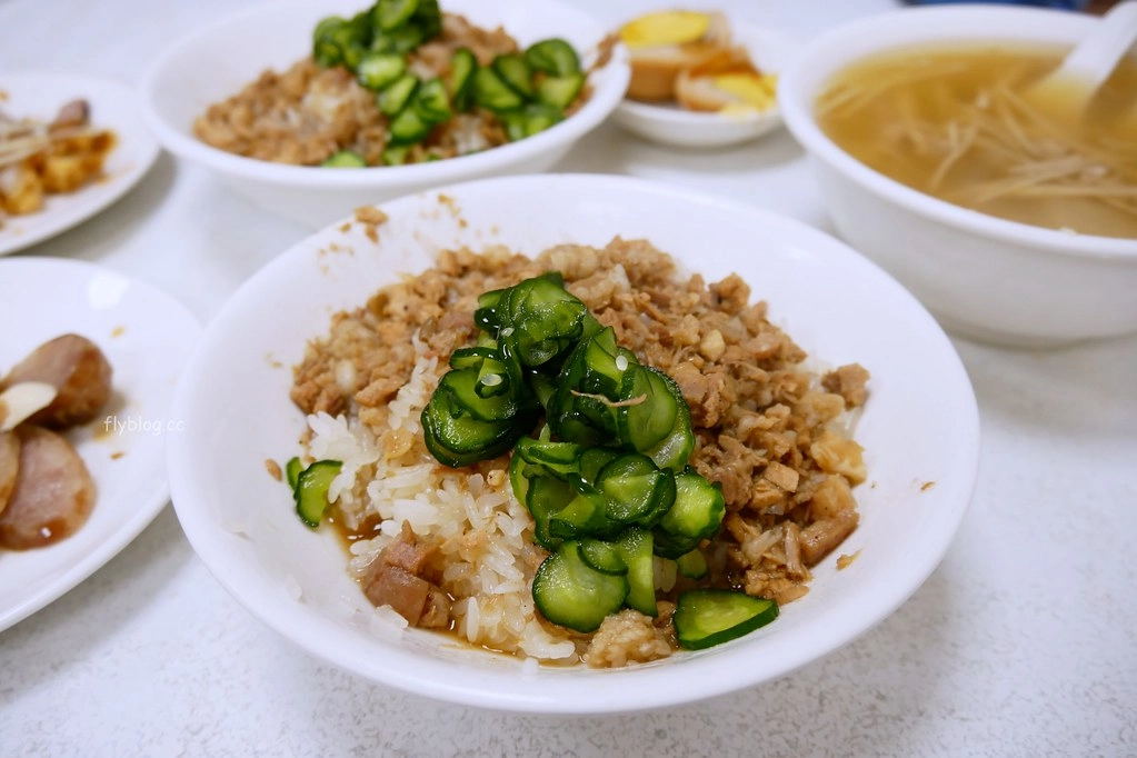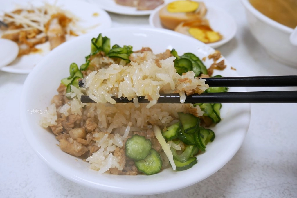 其實員林的米糕和我們比較常吃的清水米糕是不一樣的,不是用容器分裝蒸完之後倒扣再加滷汁,而是糯米經過集體蒸過之後再加肉燥和小黃瓜…