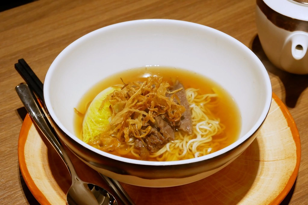 在吃之前要先倒入牛肉高湯,搭配著娃娃菜與金色洋蔥絲做點綴,舒肥過的牛頰肉Q彈帶些嚼勁,湯頭散發著濃郁香氣卻不顯得厚重,整個人都高雅了起來…