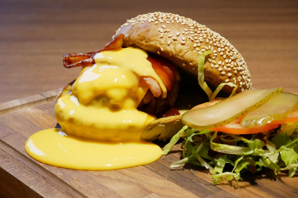 美國漢堡附熱熔乳酪醬 – $320,漢堡據說是招牌菜色之一,要吃之前要先淋上起司醬,好像土石流一下流洩下來,說有多邪惡就有多邪惡…