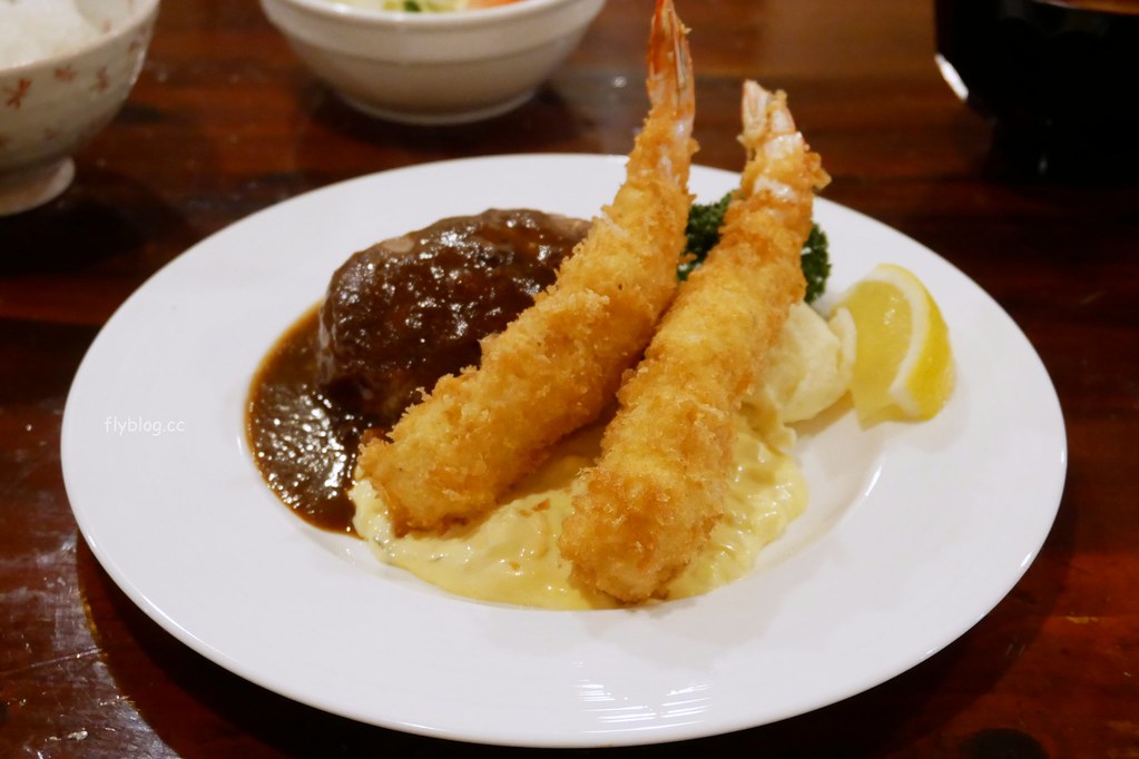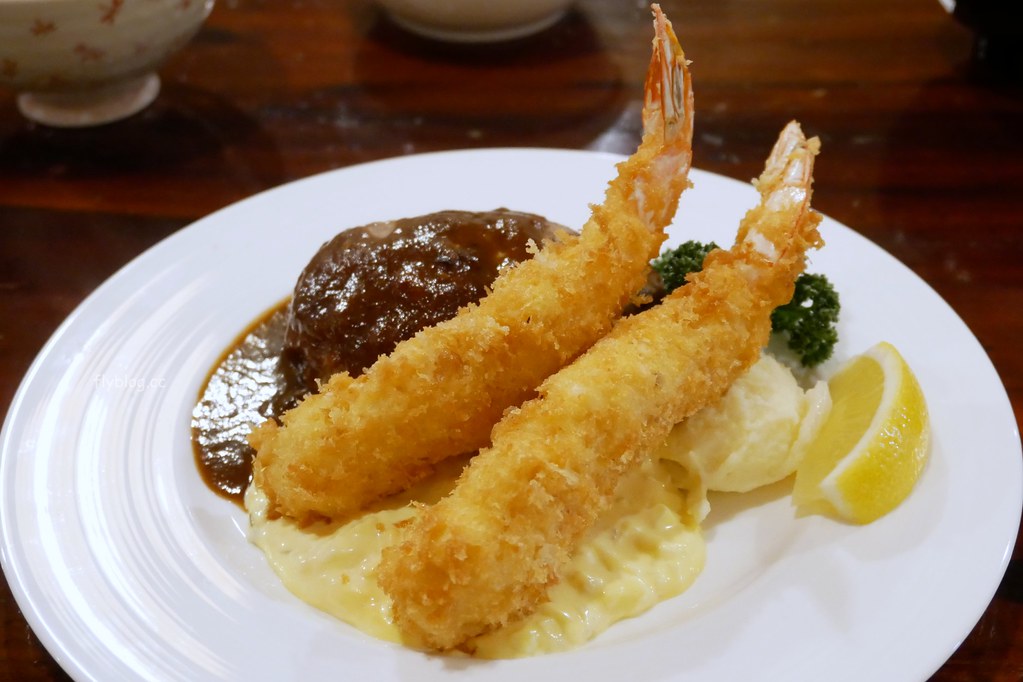 漢堡+炸蝦套餐 – 一樣給選擇性困難的人點的,有漢堡排和蝦子,底部還有一陀馬鈴薯泥,然後再淋上sauce…