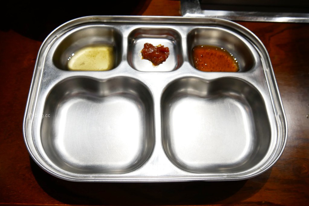 盤子裡面分別是麻油、辣醬和烤肉醬…