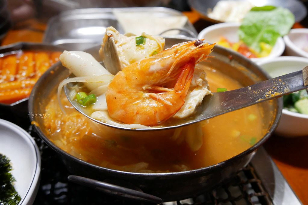 泡菜鍋裡面還有年糕和蝦子耶!感覺有誠意!