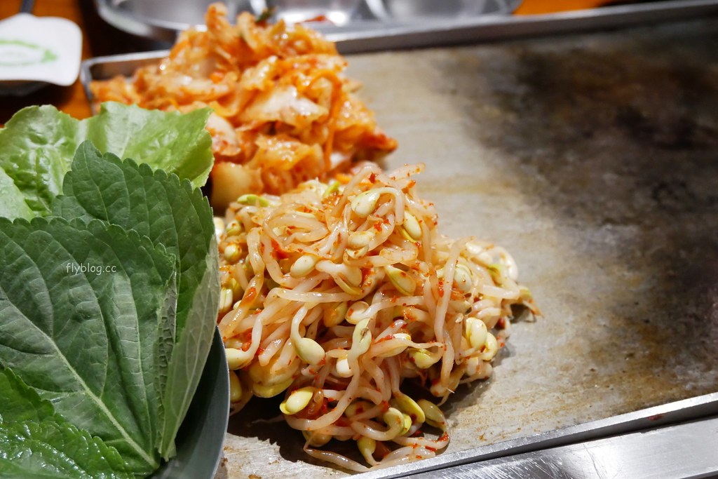 烤好的肉包覆著生菜葉和泡菜和豆芽菜一起吃真的超美味的,而且有去油解膩的效果…