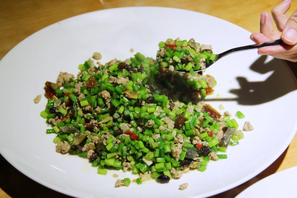 以韭菜花加上絞肉和皮蛋下去炒,看起來好像很辣,不過實際上還好,而且韭菜很輕脆好吃,鹹度也不會太高…