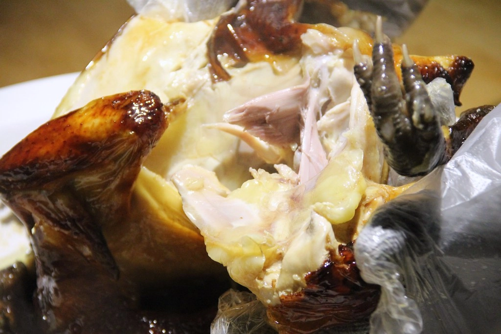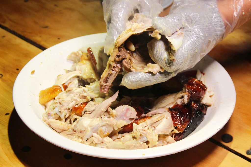 宅男以練家子的本事幫我們剝好了整隻雞,超貼心的,結果一邊剝一邊湯汁流下來,非常燙哦!