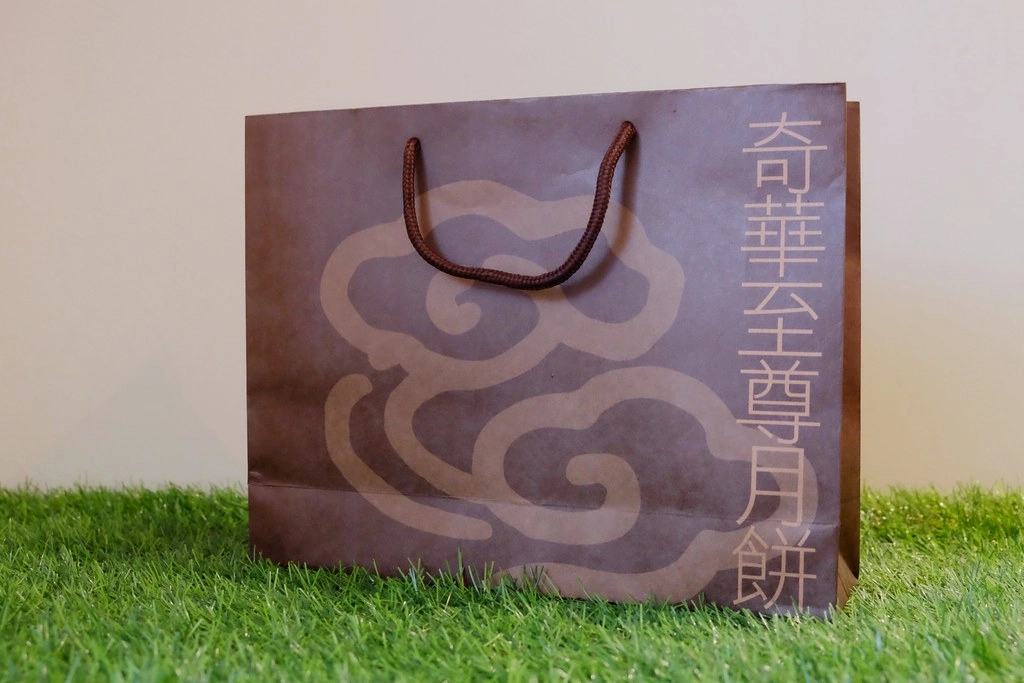 提袋是咖啡色底搭配簡單的logo條紋,還有大大的”奇華至尊月餅”6個字…