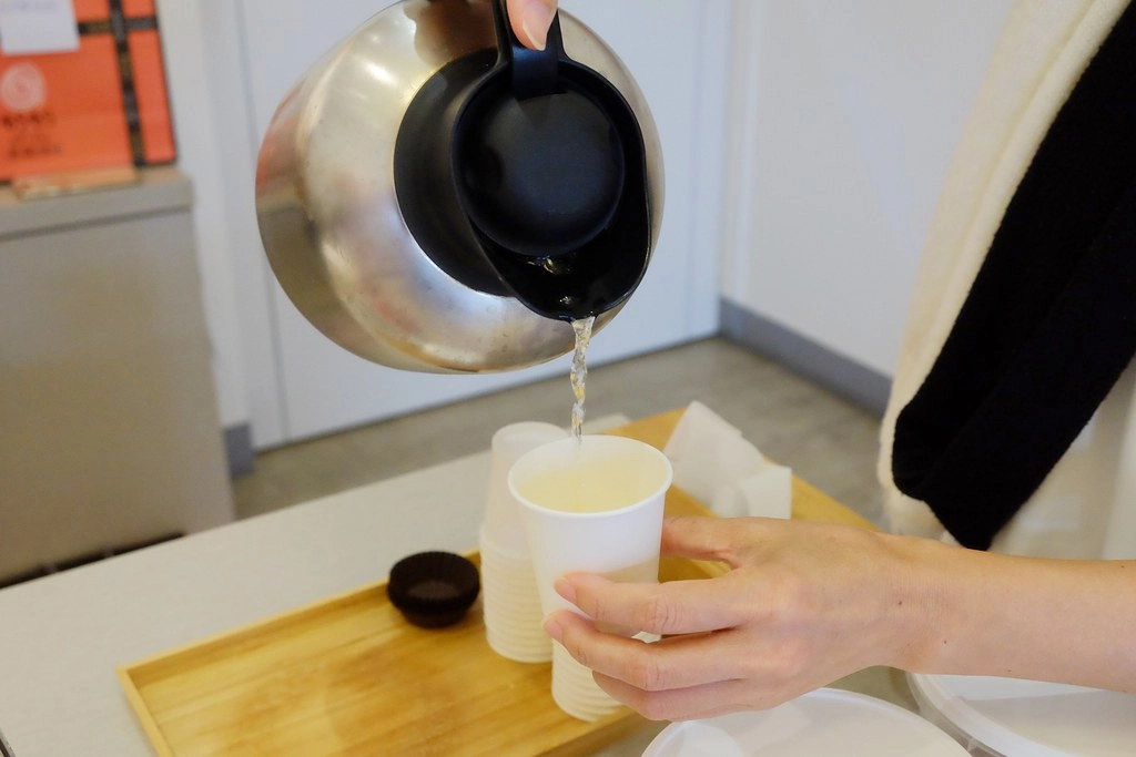 一進門店員就先倒上一杯熱茶,這個是配千層蛋捲用的,免費熱茶喝到飽!台中西屯|酒飽甜製菓所.100%日本鳥越麵粉製作,好吃又可愛的微笑蛋捲 @飛天璇的口袋