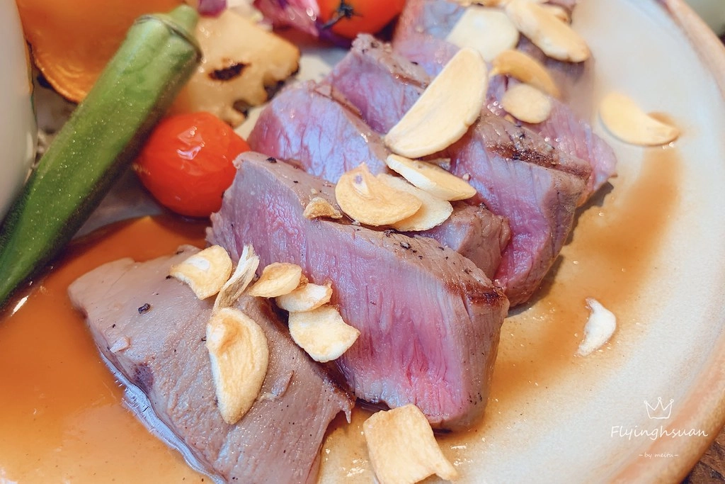 餐點送上桌,看了一下這牛排,應該是使用舒肥的料理方式,表面帶點粉紅,外皮也是粉嫩粉嫩的…