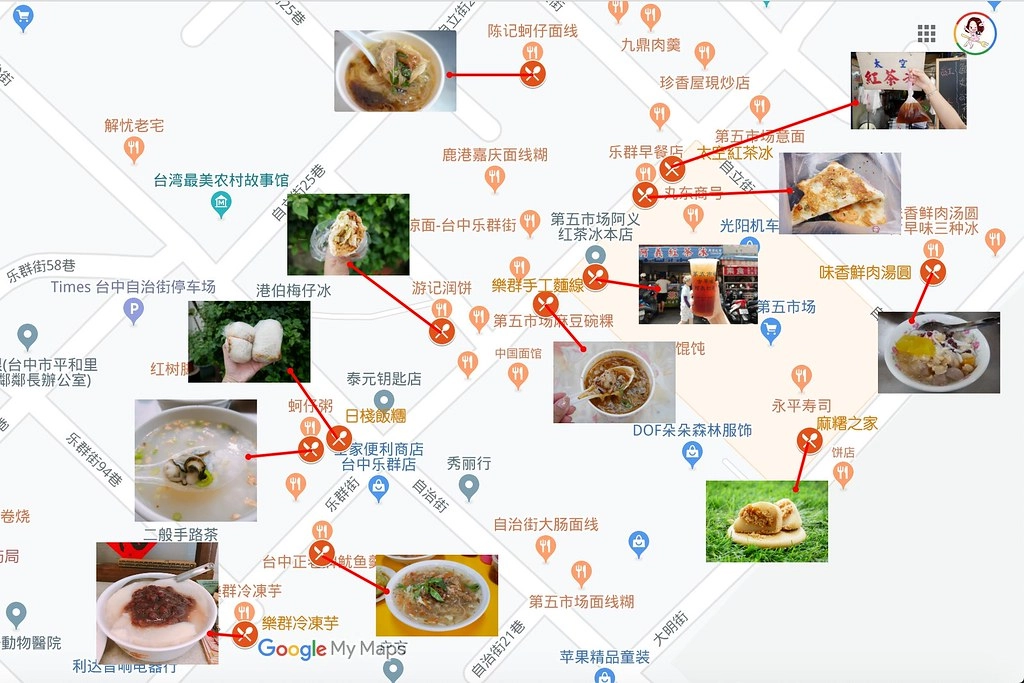 陳記蚵仔麵線 → 太空紅茶冰 → 樂群早餐店 → 阿義紅茶 → 麻糬之家 → 游記潤餅 → 樂群手工麵線 → 蚵仔粥 → 冷凍芋 → 大甲芋頭米粉湯 → 味香鮮肉湯圓 → 不一樣太陽餅 → 23號太陽餅