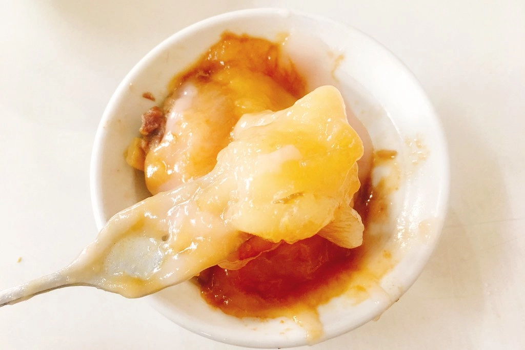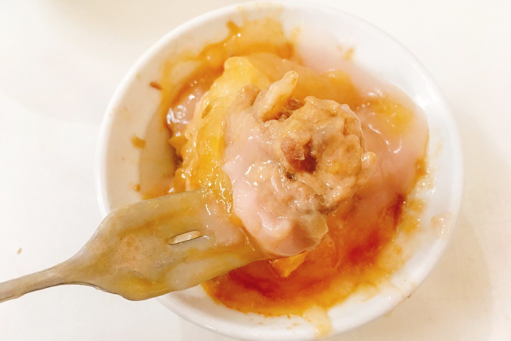 新金樹鳳梨冰的肉丸是低溫油泡,再加上大量的沾醬,體積滿大的,正常人應該是一顆就是一碗飯的份量…