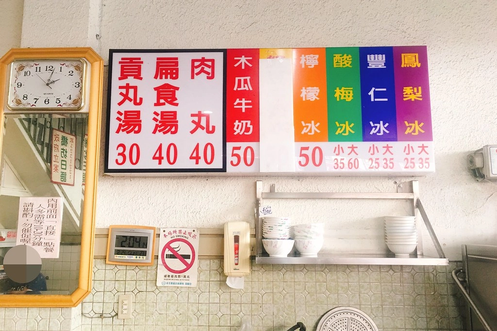 新金樹鳳梨冰店裡賣的東西很簡單,就是肉丸、扁食湯、貢丸湯,冷飲則有鳳梨冰、豐仁冰、酸梅冰和檸檬冰…