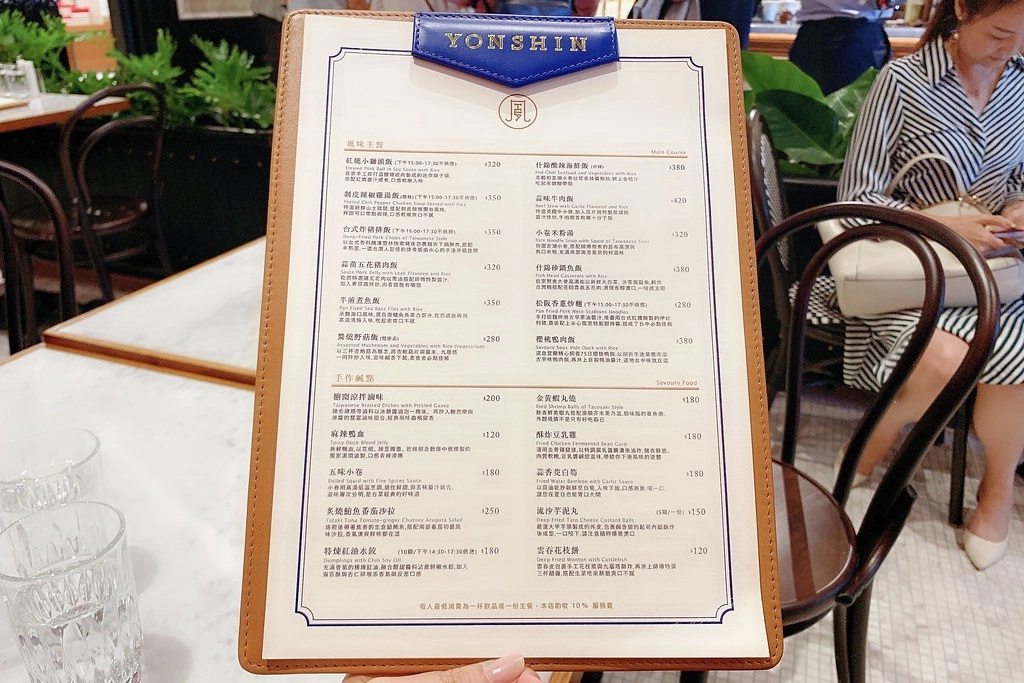 Menu…飯類、茶點和飲料為主,還要加10%的服務費…