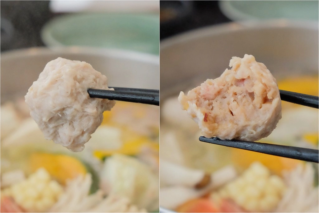 除了青菜之外,菜盤裡面還有兩種丸子,其中有一種是包芋頭的,這個我覺得好好吃喔!