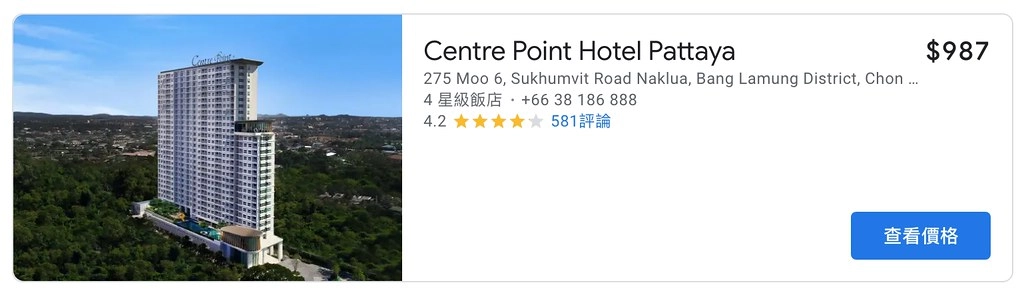 一間是位於Terminal21旁邊的「Grande Centre Point Pattaya」(看房價),另外一間就是我們住的這間中心點飯店 Centre Point Hotel Pattaya…
