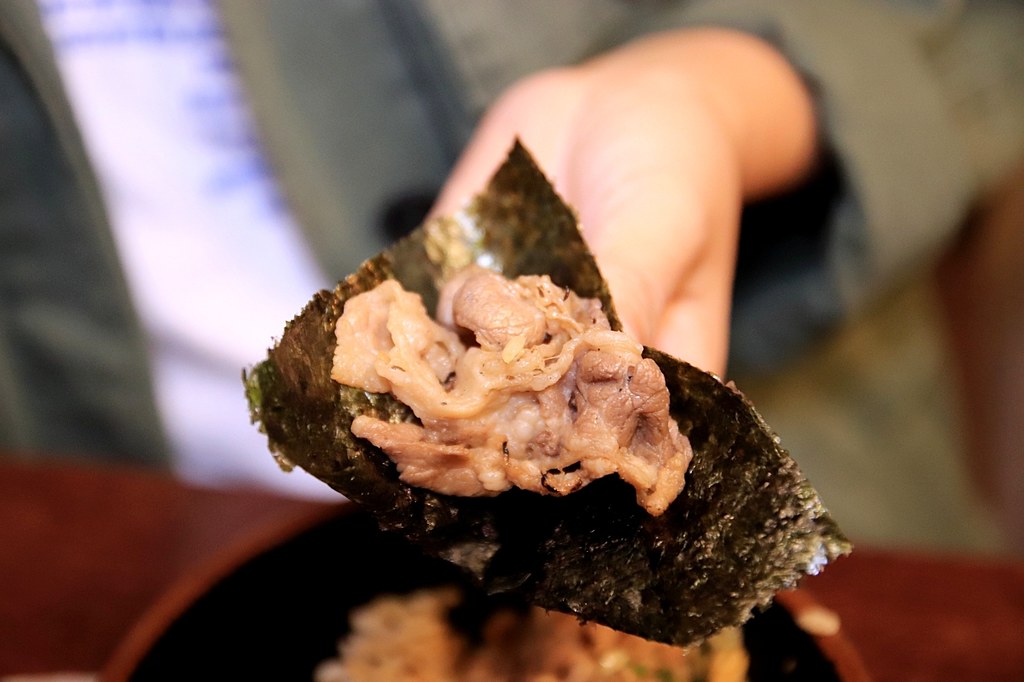 也可以像這樣把飯包著海苔,或者把溫泉蛋攪破之後拌著飯吃,就變得很有層次感哦!而且米飯軟硬適中粒粒分明,和著醬汁吃真的很順口…