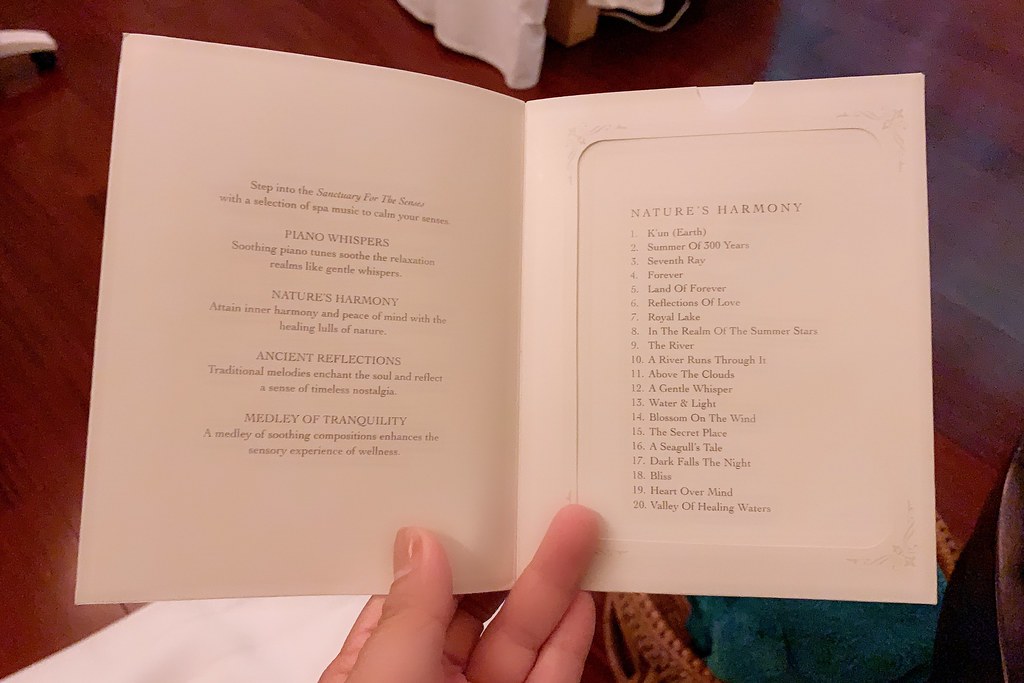 在按摩之前按摩師還拿了一個目錄要我自已挑選喜歡的音樂,不過我沒什麼概念,就請她自已決定了…
