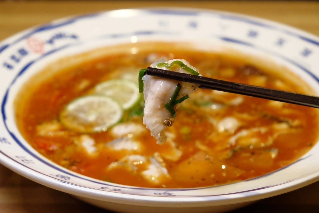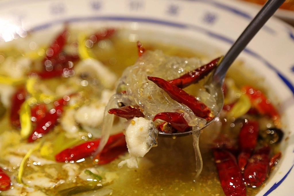 這道酸菜魚還加辣椒和菊花點綴,表面上看起來好像很辣但其實不會…