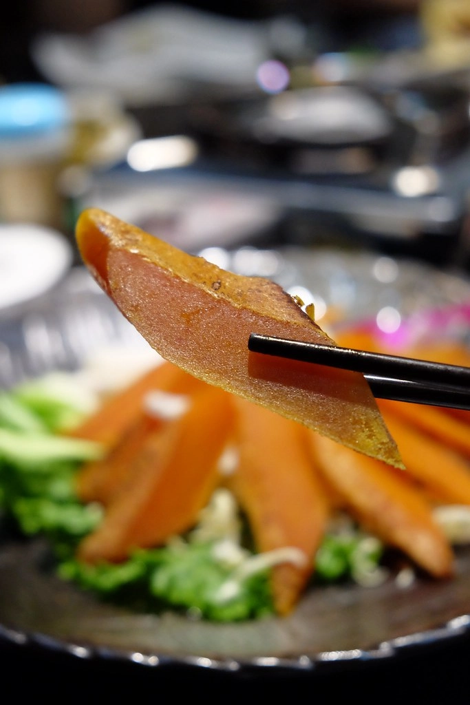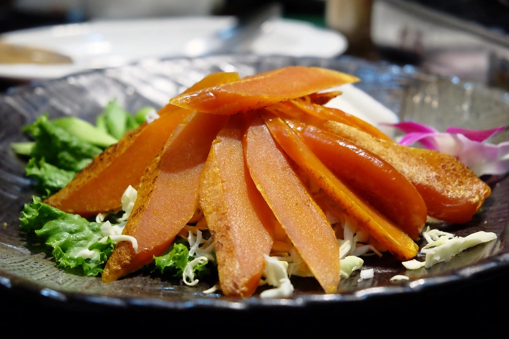 這烏魚子真的沒在客氣的,厚度好實在!內行人是加點蒜苗和蘿蔔片一起吃,不過我不敢吃蒜苗,加了蘿蔔片倒是吃了好幾個…