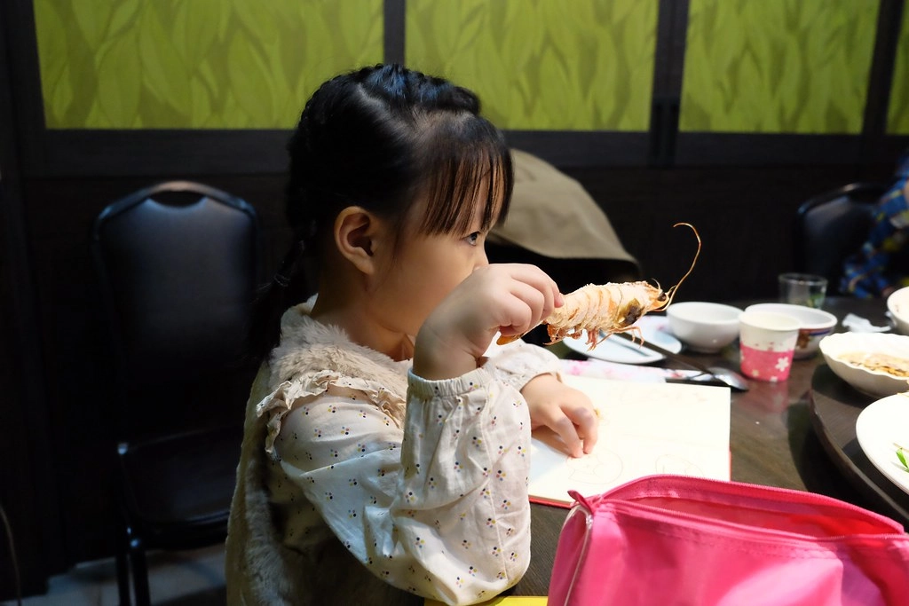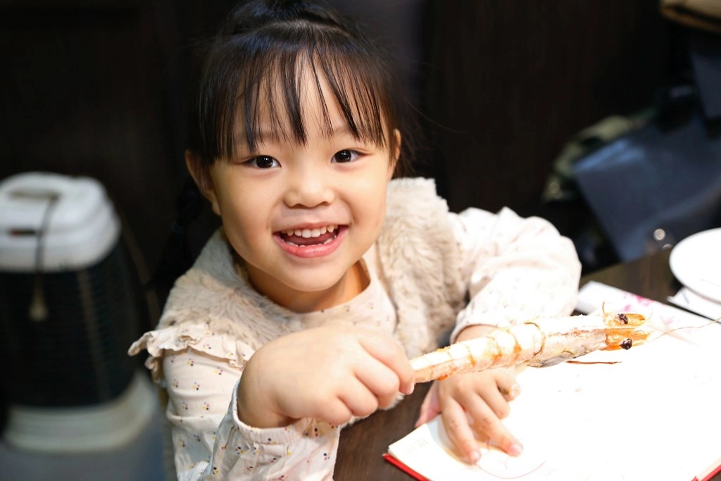 為娘很用心的幫她把蝦殼剝好再給她吃,沒想到向來很少剝蝦的我被大家笑說一隻蝦被我剝到糊糊爛爛的…(跪~