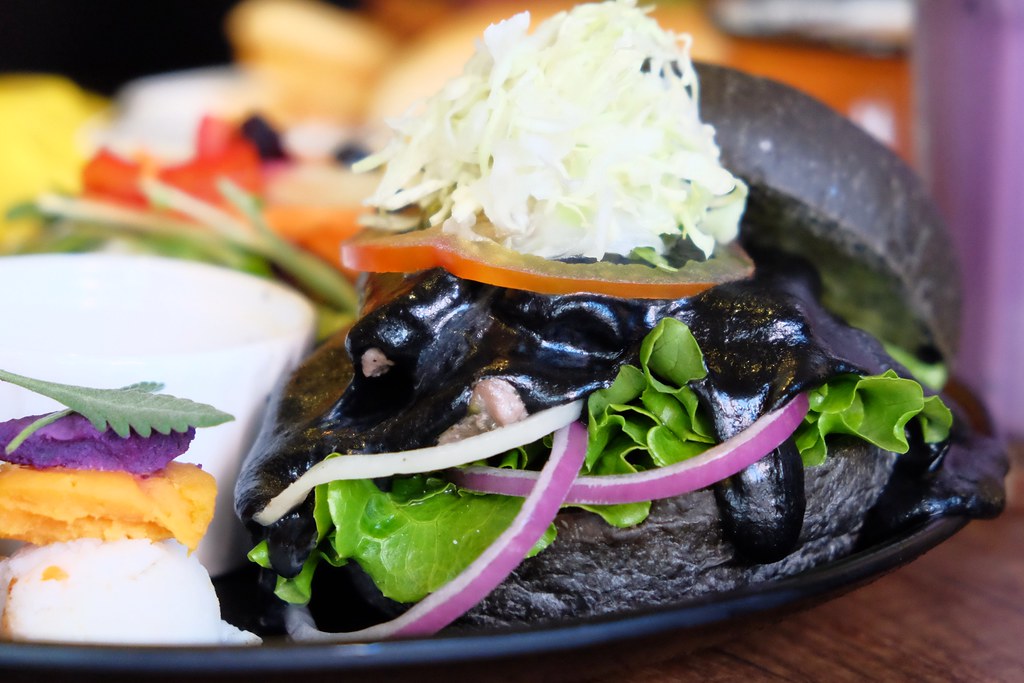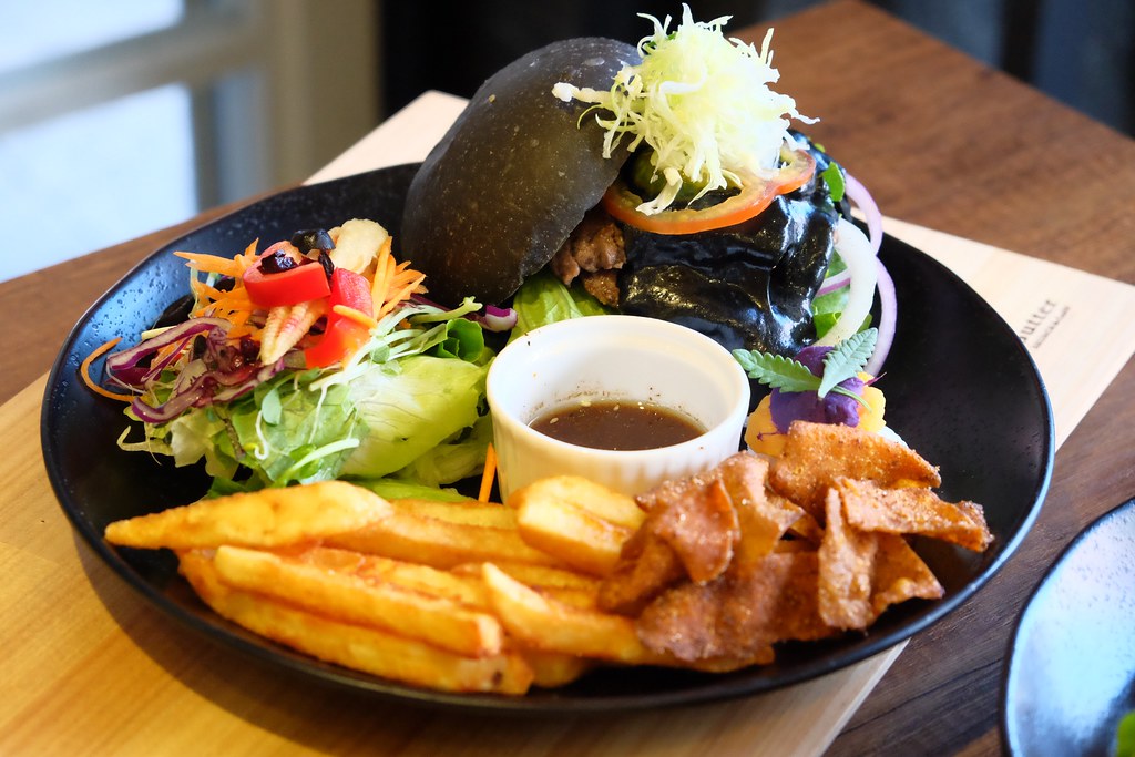 以竹炭麵包為基底,搭配著黑起司,其實視覺上看起來是一個非常狂妄的漢堡…
