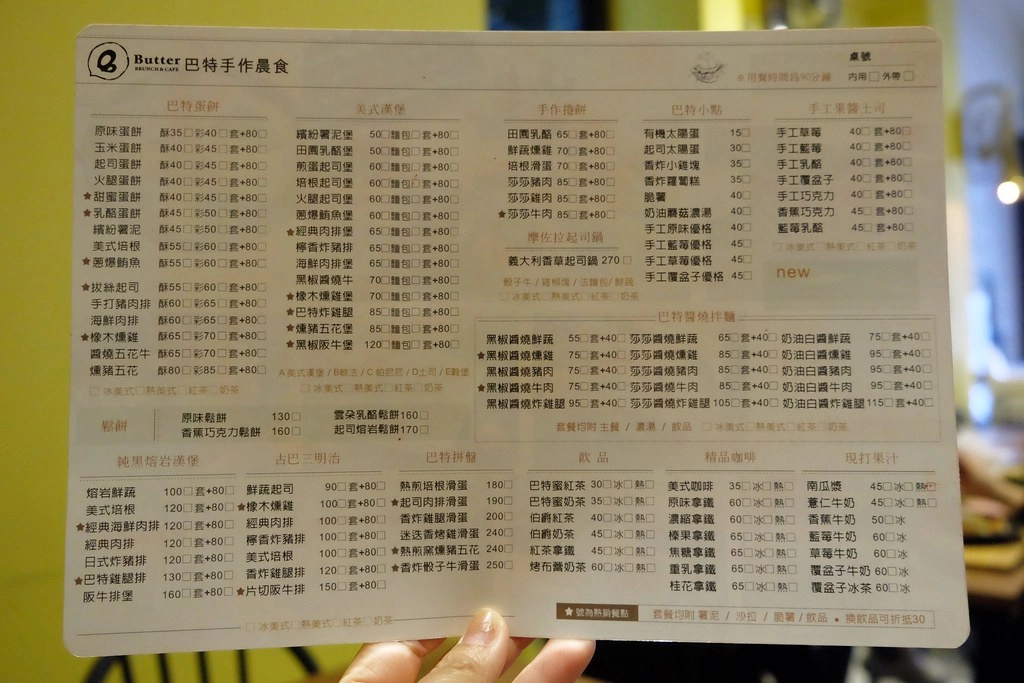 Menu…餐點主打食材新鮮、現點現作,供應品項也豐富多元,有巴特蛋餅、純黑熔岩漢堡、美式漢堡、古巴三明治、巴特拼盤、手作捲餅、摩佐拉起司鍋、巴特醬燒拌麵、手工土司、鬆餅和飲品咖啡果汁…等。