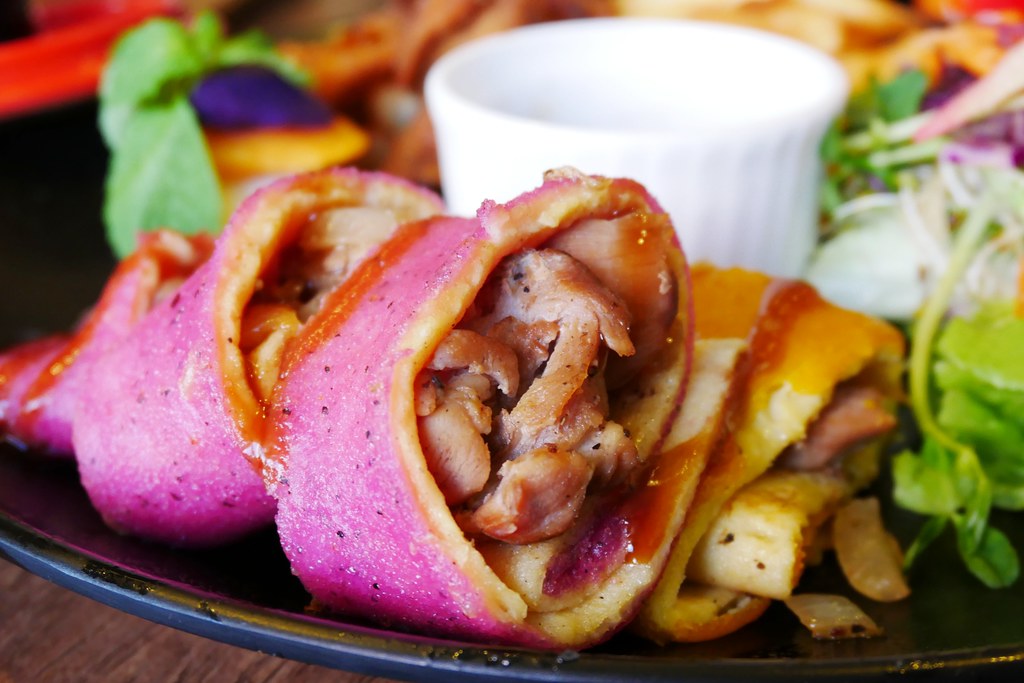 粉紅色口味的蛋餅是”醬燒五花牛”,這個是使用火龍果天然色素製成的,吃起來其實並沒有火龍果的味道…