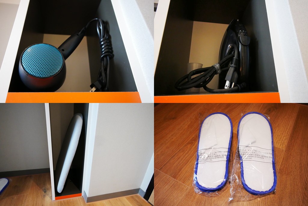 入口處有連身鏡,吹風機、燙板和熨斗都在櫃子裡了,地板鞋也有幫忙準備,很符合商務客人的需求…